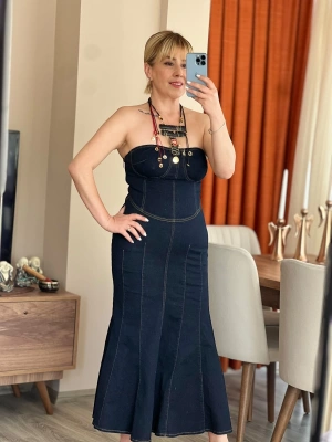 Lacivert Tensel Gömlek Yaka Elbise – Önden Düğmeli