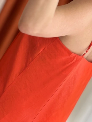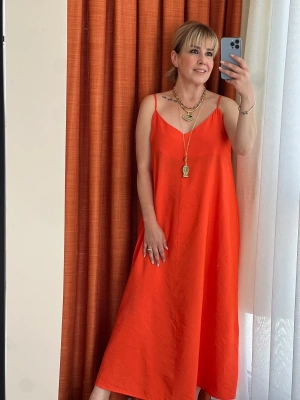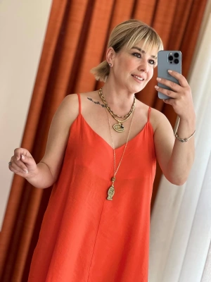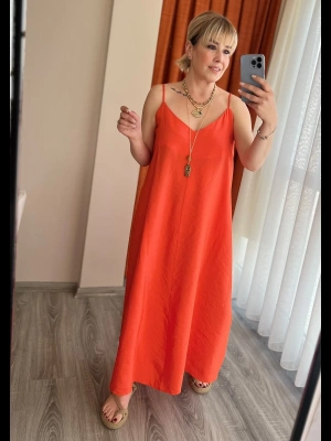 KİREMİT RENGİ KETEN ASİMETRİK ELBİSE