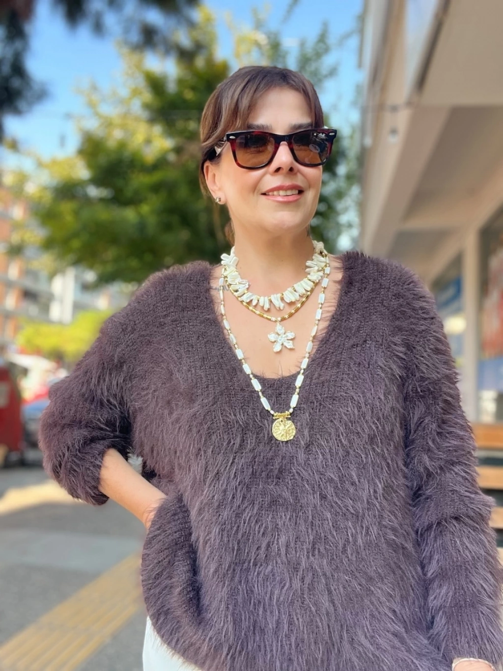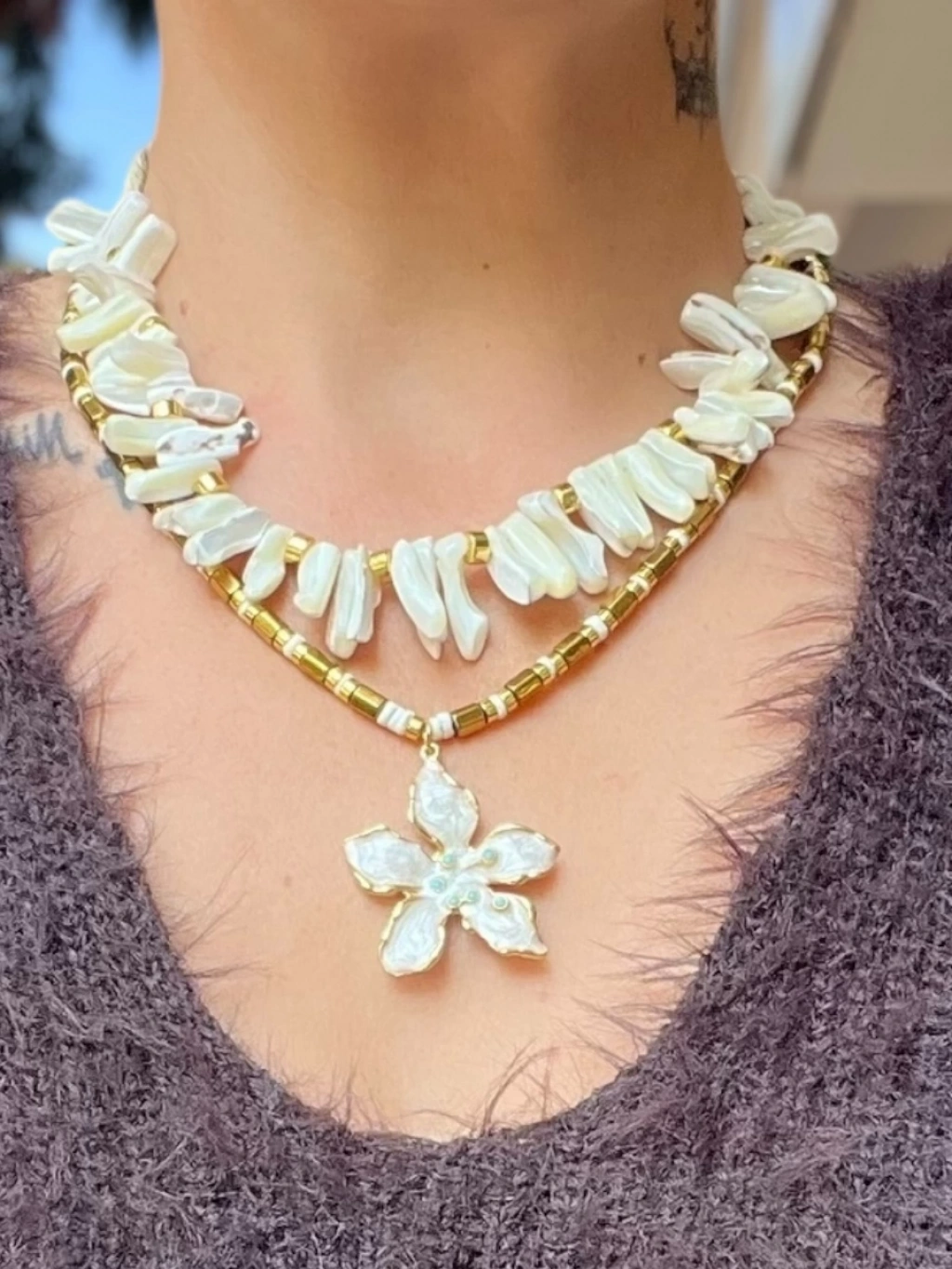 • Doğal sedef taşlarından oluşan Fleur Kolye, zarafeti ve doğallığı bir araya getirir. Çiçek formundaki barok inci detay, feminen enerjiyi temsil eder. Günlük ya da özel kombinlerde ışıltılı bir dokunuş sağlar.