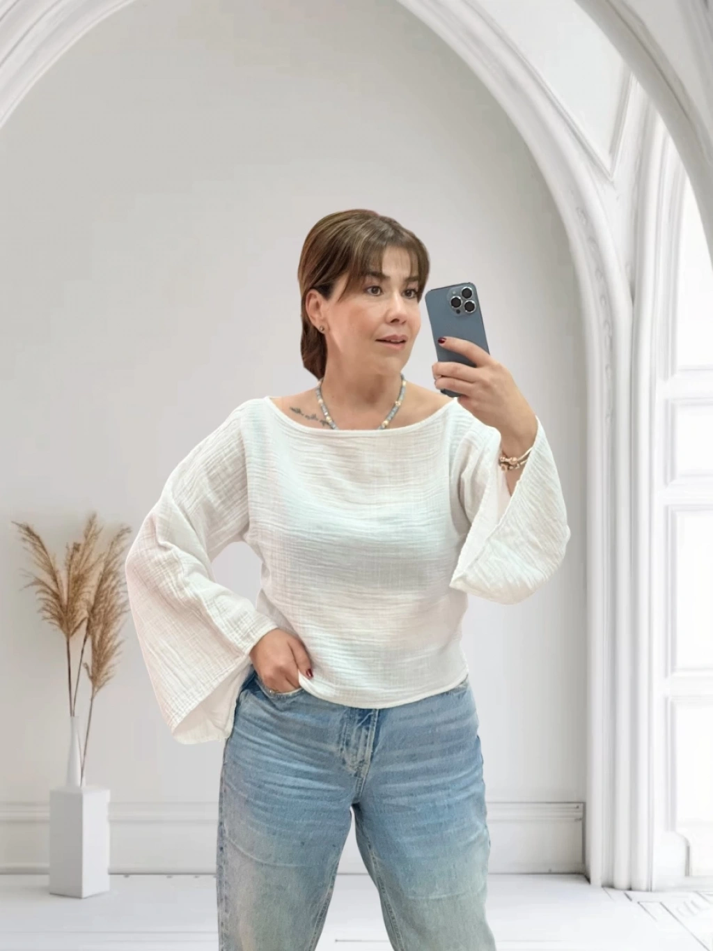 • Doğal müslin kumaştan üretilen Luna Bluz, hafif dokusu ve geniş kollarıyla gün boyu konfor sunar. Kayık yaka detayı şıklık katarken, jean veya yüksek bel eteklerle zahmetsizce kombinlenebilir. Yazın serin, baharda kat kat giyime uygun.