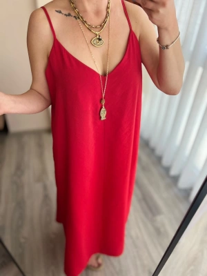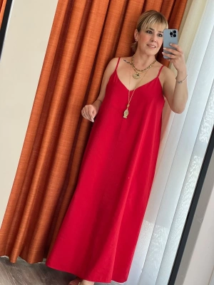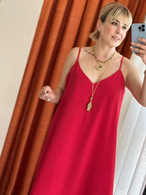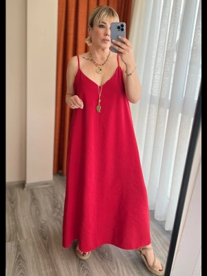 KİREMİT RENGİ KETEN ASİMETRİK ELBİSE