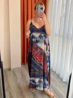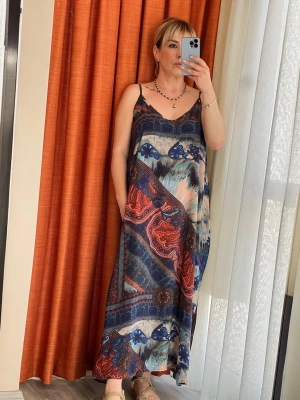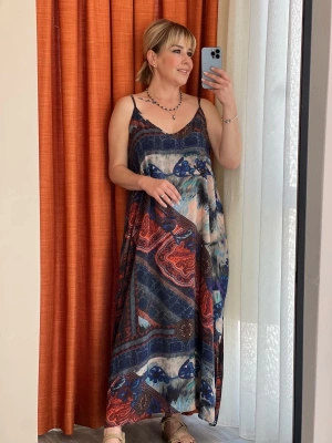 Lacivert Mandala Askılı Elbise – Organik Viskon