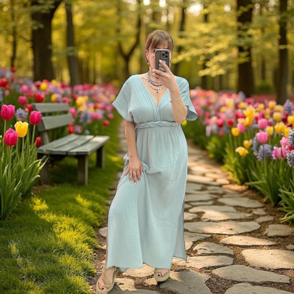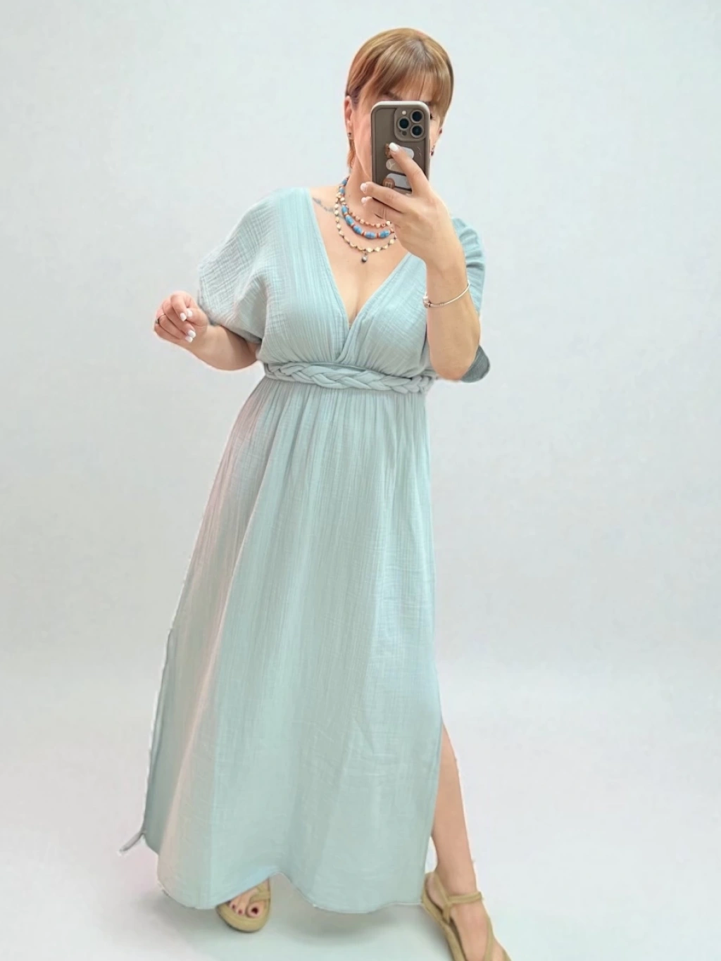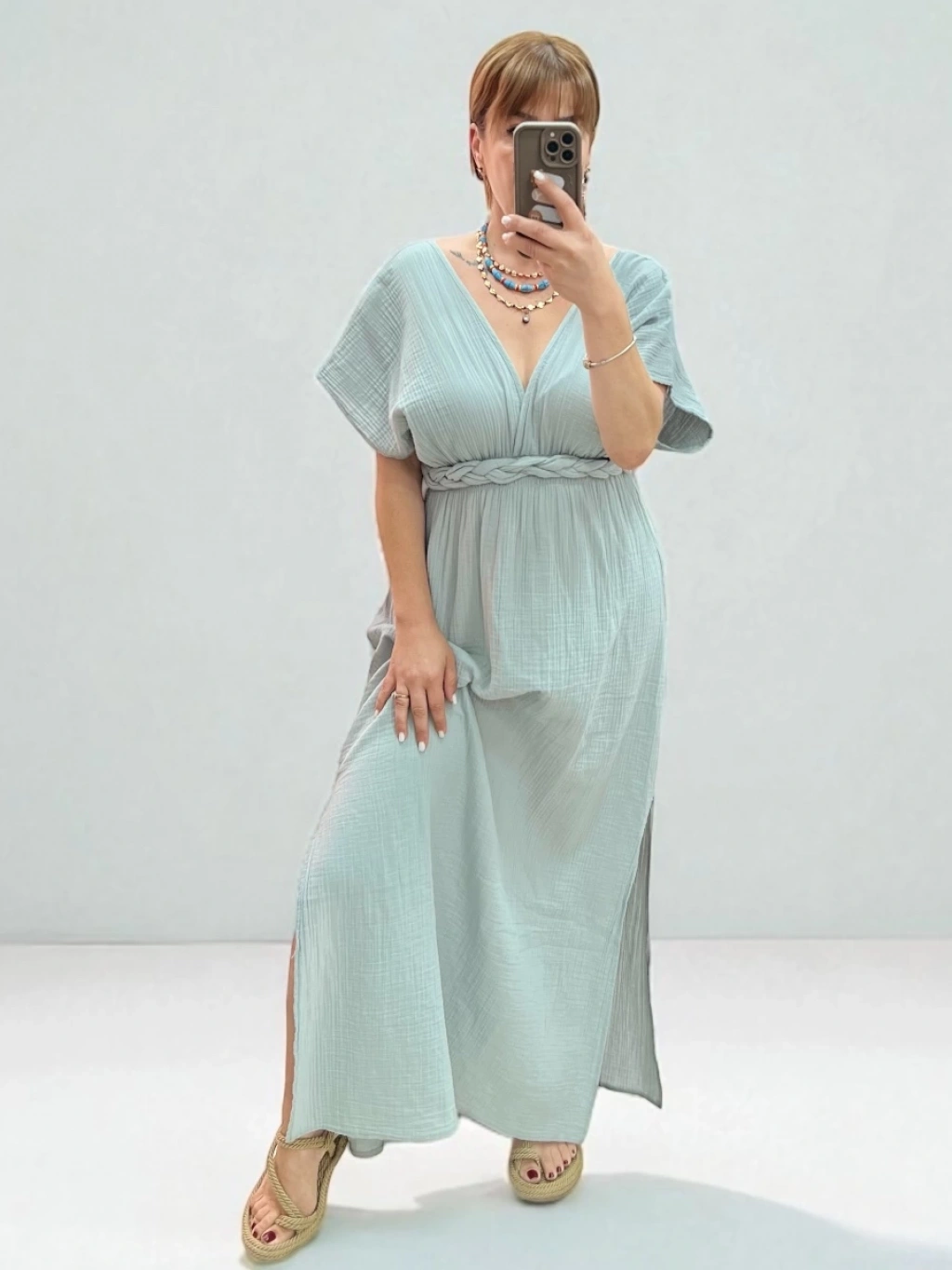 Yumuşacık müslin kumaşın ferah dokusu ile yazın her anında konforlu hissedin. Ön ve arka V yaka tasarımı, çıkarılabilir saç örgü kemeri ve bel lastik detayı ile hem günlük hem de tatil kombinleri için uygundur. İki yandan yırtmaç detayı yürüyüş rahatlığı sağlar. Standart bedeni ile farklı vücut tiplerine uyum gösterir.