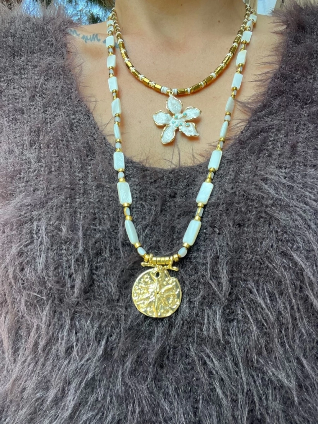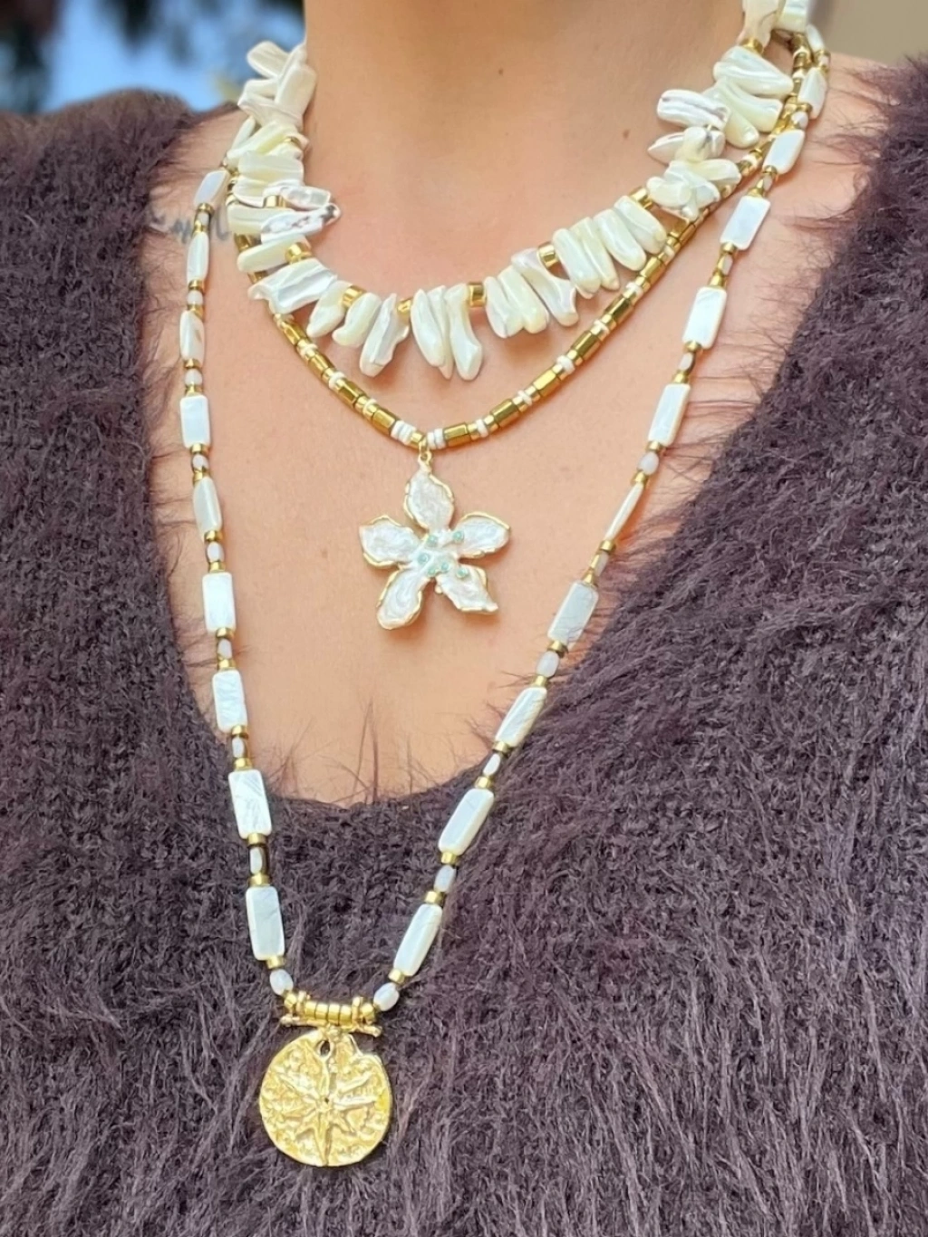 • Gücü ve ışığı simgeleyen Solara Kolye, sedef ve altın detayların uyumunu taşır. Eski çağ sembollerinden ilham alan madalyon detayı, zamansız bir stilin anahtarıdır.