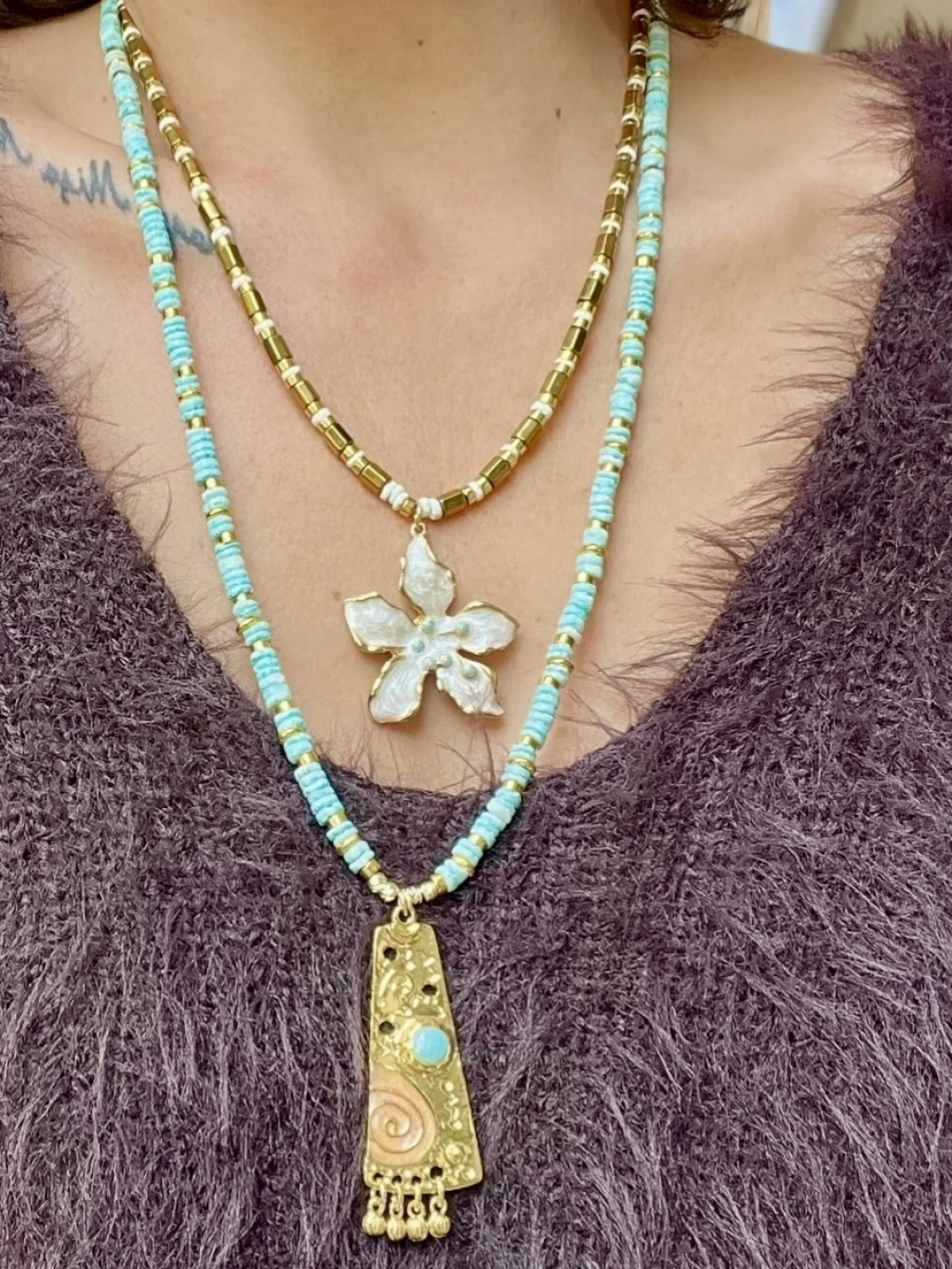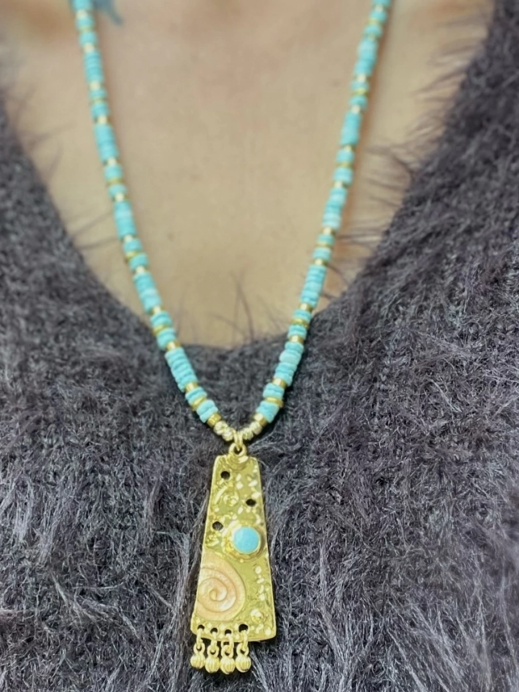 • Denizin huzurunu taşıyan turkuaz Sirena Kolye. Negatif enerjiden arındıran, el yapımı doğal taş kolye. Tarzına pozitif dokunuş kat!