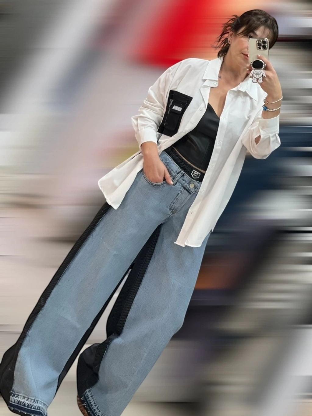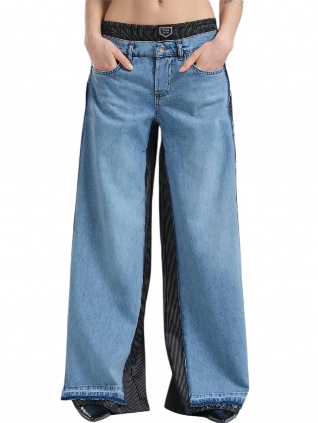 Tw Jean, sıradan jean kalıplarına yenilikçi bir yorum getiriyor. Ön kısmı denim, arka kısmı saten çizgili kumaşla tasarlanan bu özel parça, tarzına fark katmak isteyen kadınlar için üretildi. Oversize gömlekler veya crop top’larla kombinleyerek sokak stilinin enerjisini yansıtın.
