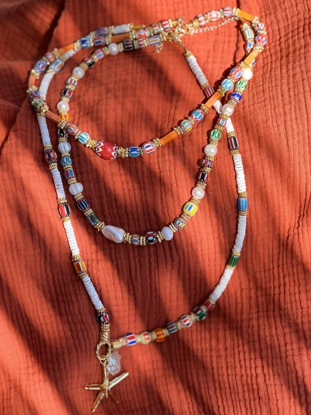 • Turuncu varasit taşları, Nepal boncuklar ve 24 ayar altın kaplamalarla hazırlanmış bu tasarım kolye, etnik detaylarla modern ışıltıyı bir arada sunuyor.